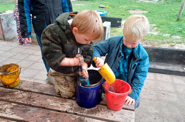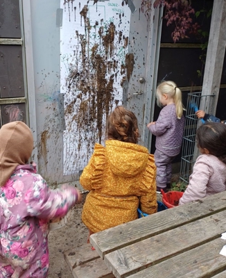 I efteråret 2024 arbejder vi med fortælleteater og eventyret Klods Hans. Vi har arbejdet med eventyret på mange forskellige måder og den ene dag endte det med, at børnene ville kaste mudder efter oldermanden - så det gjorde vi da.